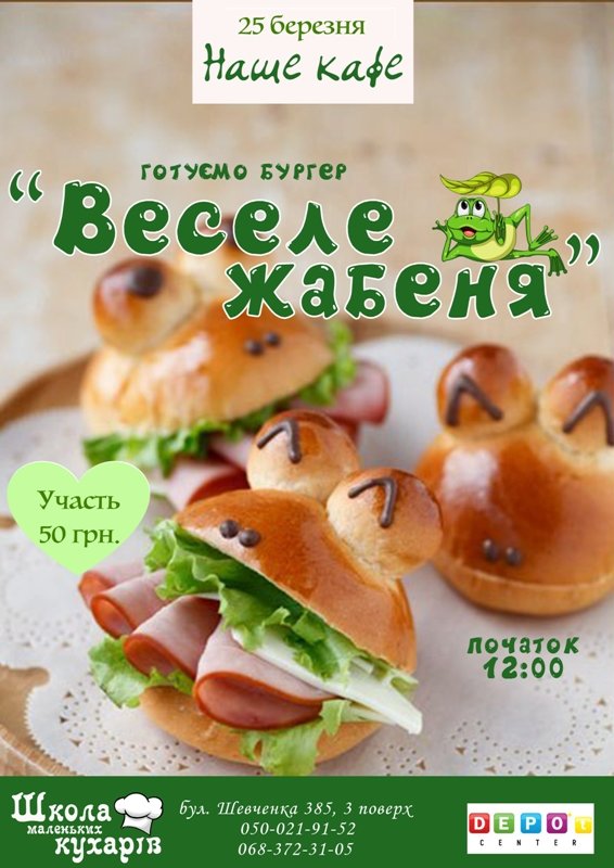 25 березня у м.Черкасси, за адресою :бул.Шевченка,385 ми чекаємо Вас та ваших діточок та будемо готувати "веселе жабеня"