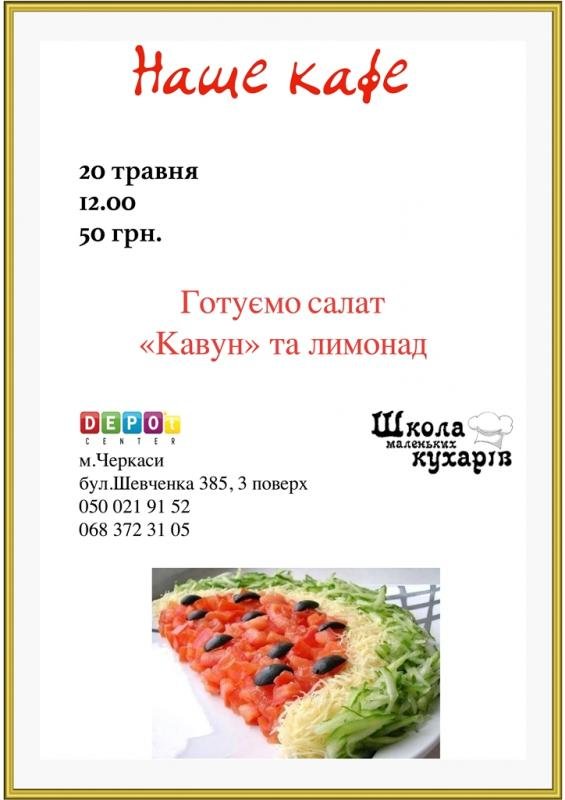20 травня у м.Черкасси, за адресою :бул.Шевченка,385 ми чекаємо Вас та ваших діточок та будемо готувати салат"Кавун" та лимонад.