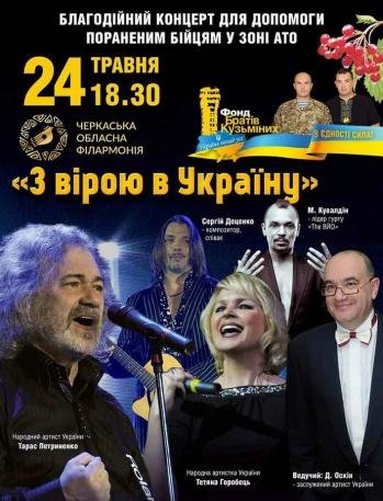 Бійці, що отримали травми в зоні АТО, здебільшого залишаються сам-на-сам зі своєю проблемою. 24 травня в Черкаській обласній Філармонії Фонд братів Кузьміних проводить благодійний концерт "З вірою в Україну", метою якого є допомога нашим важкопораненим бійцям, а також збір коштів на відкриття реабілітаційного центру в Черкасах.