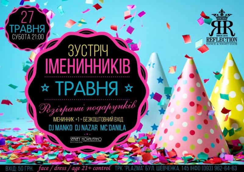 Місяць добігає кінця, тому саме час для розіграшу подарунків від "REFLECTION" та наших постійних партнерів для іменинників травня. Музичний настрій створюють DJ NAZAR та DJ MANKO.