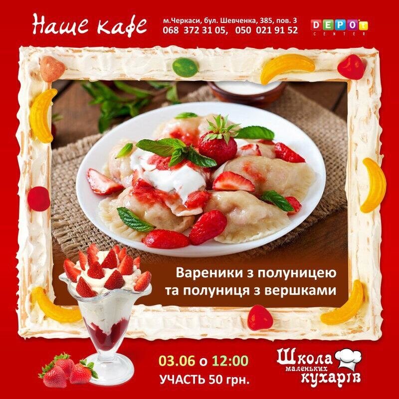 Описание:Школа маленьких кухарів запрошує діточок на майстер класс з приготування вареників з полуницею та полуниці з вершками.Чекаємо на вас:м.Черкаси,вул.Шевченка,
