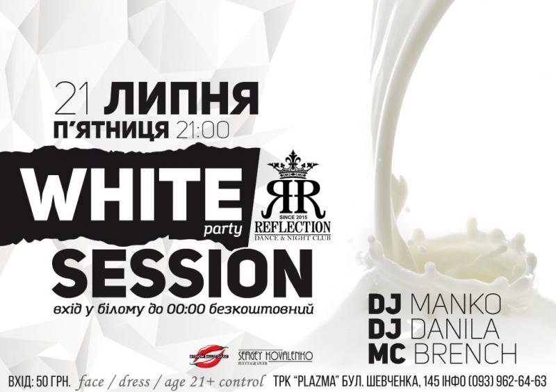 «WHITE SESSION party» ніч якою править тільки білий колір. Ваше білосніжне вбрання зробить вечірку вишуканою та неповторною. Музичні новинки від DJ DANILA та DJ MANKO. Голос ночі MC BRENCH. Розіграш подарунків від "REFLECTION" та наших постійних партнерів. Для Вас працюють фотограф Сергій Коваленко та pj-балет Djuls.