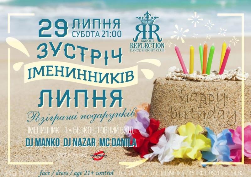 «ЗУСТРІЧ ІМЕНИННИКІВ» - святкова вечірка для тих, хто народився в липні. Місяць добігає кінця, тому саме час для розіграшу подарунків від "REFLECTION" та наших постійних партнерів для іменинників липня.