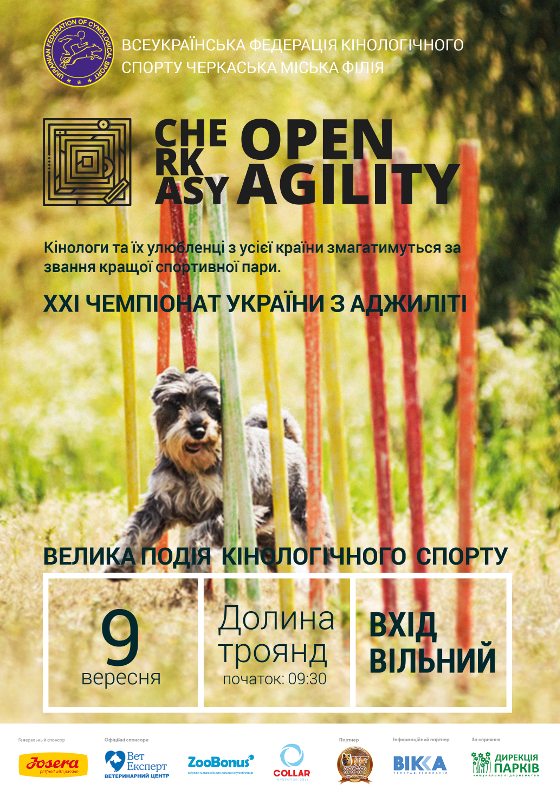 XXI Чемпіонат України з аджиліті #СherkasyOpenAgility - це щорічні всеукраїнські змагання з аджиліті (кінологічний спорт), метою яких є розвиток кінологічного спорту в країні та привернення уваги суспільства та власників собак до проблеми вихованості і дозвіллі чотирилапих.