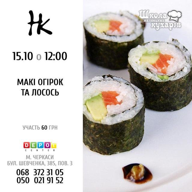 Описание:Школа маленьких кухарів запрошує діточок на майстер класс з приготування макi огiрок та лососю. Чекаємо на вас:м.Черкаси,вул.Шевченка,385,3 поверх, тел.068-372-31-05,050-021-91-52