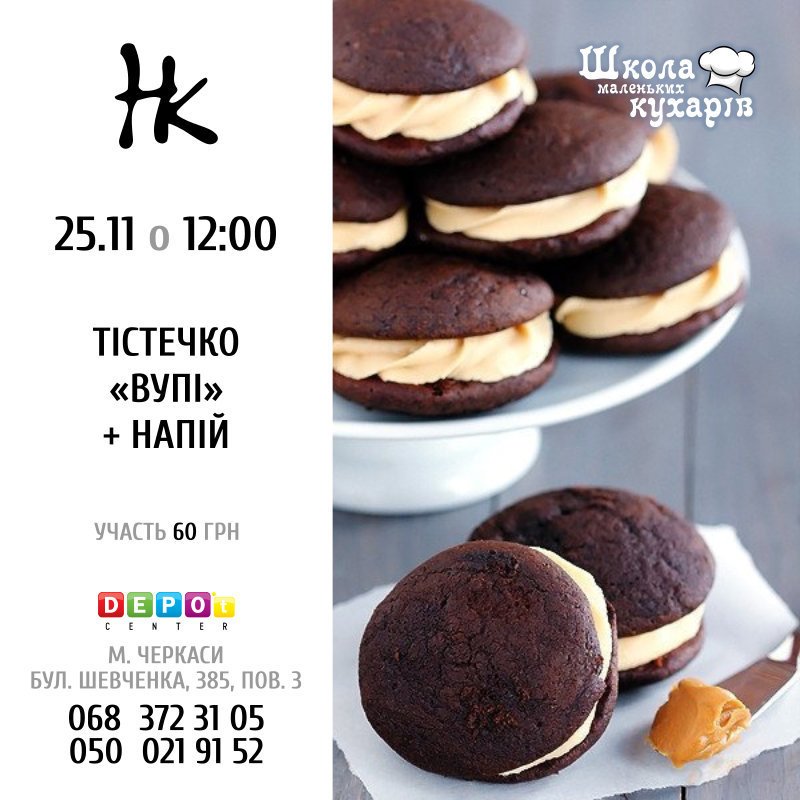 Школа маленьких кухарів запрошує діточок на майстер класс з приготування тістечка "Вупі" та напою. Чекаємо на вас:м.Черкаси,вул.Шевченка,385,3 поверх, тел.068-372-31-05,050-021-91-52