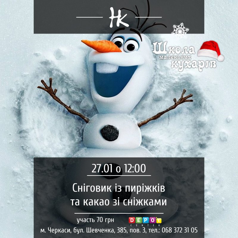 Школа маленьких кухарів запрошує діточок на майстер класс зприготування сніговика із пиріжків та какао із сніжками. Чекаємо на вас:м.Черкаси, вул.Шевченка,385 ,3 поверх, тел. 068-372-31-05 , 050-021-91-52