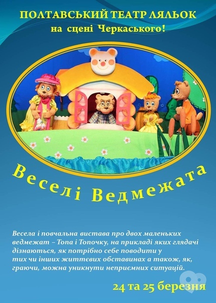 Весела і повчальна вистава про двох маленьких ведмежат - Топа і Топочку, на прикладі яких глядачі дізнаються, як потрібно себе вести в тих чи інших життєвих обставинах а також, як, граючи, можна уникнути неприємних ситуацій.