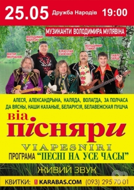 Пісняри - легендарний вокально-інструментальний ансамбль з Мінська. Колектив під керуванням В. Г. Мулявіна був створений в 1969 році. Їх головні хіти "Касіў Ясь канюшину", "Біловезька пуща", "Білорусія", "Вологда", "За півгодини до весни", "Крик птаха".