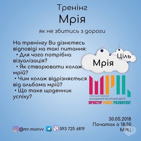 Шлях до успіху починається з мрії, а не за дипломом. На жаль, цьому не вчать у школі. Мета тренінгу-навчити учасників працювати з мрією, розвивати її і не звертати з шляху до мрії.