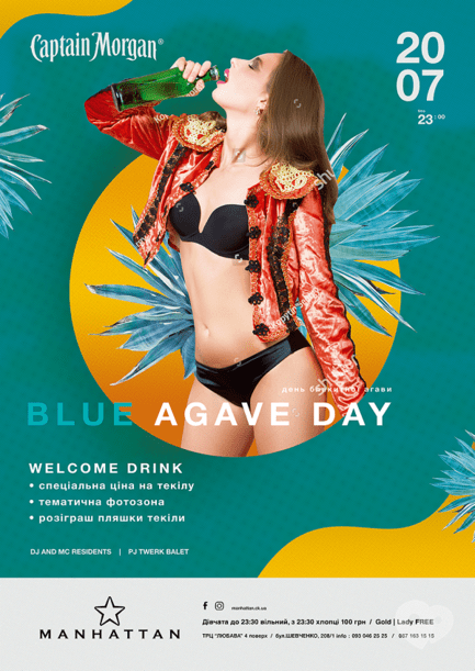 Текіла – це завжди спонсор цікавих нічних пригод у кожного, хто хоч раз стикався з цим диво-напоєм! В цю ніч ми відзначимо день блакитної агави, і вшануємо це свято тематичним велкам дрінком для гостей, так само розіграємо багато подарунків для гостей серед яких сертифікати на вхід, коктейлі і ціла пляшка текіли !