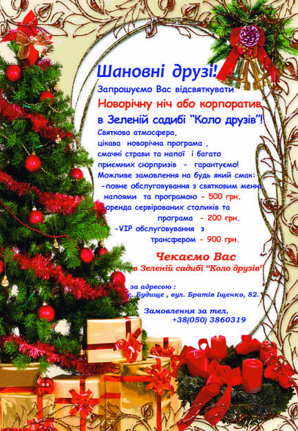 Новорічний корпоратив за містом, нова прикрашена банкетний зал, смачне святкове меню, анімаційна програма з ведучою, конкурсами, дискотекою та фаєр шоу. Можливість замовлення трансферу.