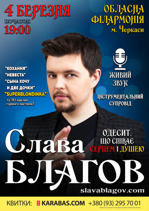 Слава Благов – галантный и экстравагантный , с утончённым вкусом современности , молодой и привлекательный одессит , талантливый поэт , композитор и певец , с уже определённым стилем и направлением в искусстве покорять Сердца Поклонниц , отправляется в концертный тур в сопровождении бэнда , в живое исполнение которого вносит своеобразный музыкальный колорит молодой и талантливый баянист Украины – Владимир Войцеховский. Песни талантливого исполнителя многие слышали на радиостанциях страны и в интернете , но зачастую слушатели не знают своих кумиров в лицо. Единственный исполнитель в Украине , чья песня «По улицам Высоцкого» является достоянием всемирно-известных музеев им. В.Высоцкого в США и Польше. Свадебный хит «Невеста», дуэтная песня с группой «Дюна» «Дорога домой», известная песня в дуэте с Михаилом Грицканом « Поворот» , песни «Золотая», «Кохання», «Мама» и конечно же Премьера : Хит этого года – «SUPERBLONDINKA». Ждём Вас на концертах Славы Благова , где Вы получите максимум положительных эмоций и позитива, слушая песни , которые поются Сердцем и Душой очаровательного одессита !