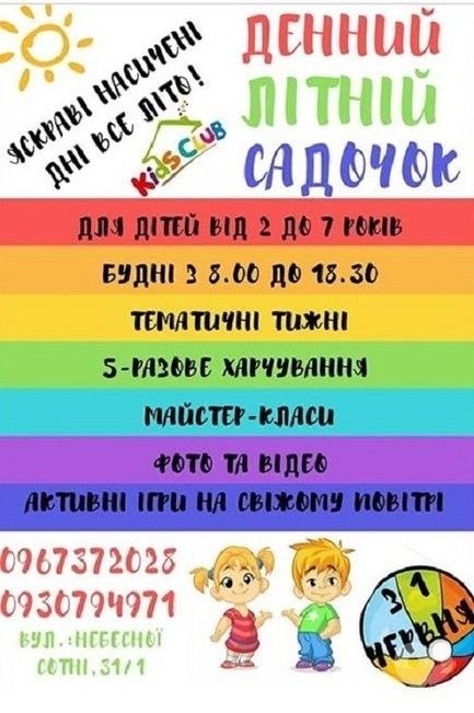 Запрошуємо діток від 2-7 років провести літо разом з нами! Які пригоди чекають діток? Тематичні тижні з запрошеними гостями, цікаві квести і розвиваючі заняття, 5-ти разове харчування, майстер-класи та творчі студії, цікаві та пізнавальні екскурсії, заняття спортом, дискотеки, веселощі в басейні і багато ігор і розваг на свіжому повітрі.