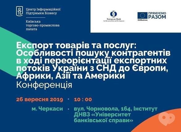 Центр інформаційної підтримки бізнесу Київської ТПП за підтримки ЄБРР в рамках ініціативи EU4Business Європейського Союзу проводить в м.Черкаси конференцію "Експорт товарів і послуг: Особливості пошуку контрагентів в ході переорієнтації експортних потоків України з СНД до Європи, Африки, Азії та Америки" для власників, керівників, фахівців малого і середнього бізнесу.