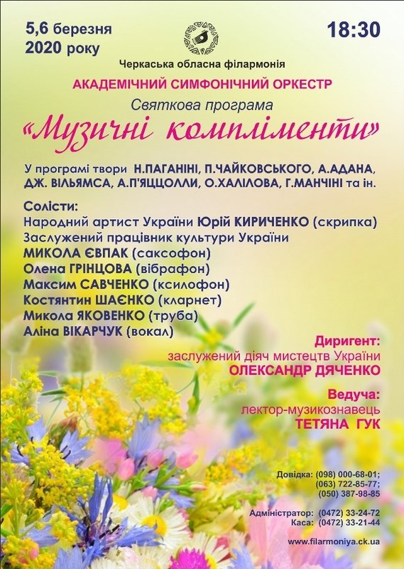 Безсумнівно, багато прихильників Черкаського академічного симфонічного оркестру вже чекають приходу весни, а з нею - і нову зустріч з класичною музикою у його виконанні. Адже всі сподіваються на програму, яка стане подарунком до Свята жіноцтва і підкреслить романтичний настрій від пробудження природи, дасть надії на краще і зробить духовно багатшими всіх слухачів. І ви не помилились – для вас симфонічний оркестр та його незмінний диригент заслужений діяч мистецтв Олександр Дяченко підготували справжні «Музичні компліменти»!