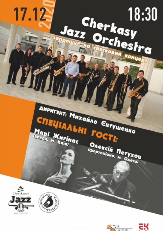 Концерт Черкаськиого джазового оркестру під керівництвом Михайла Євтушенка. Спеціальні зіркові гості: солістка Марі Жигінас (м. Київ) та піаніст Олексій Петухов (м. Одеса)!