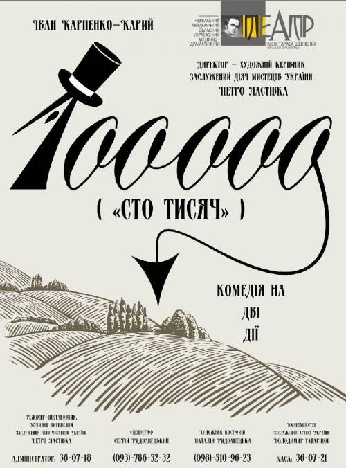Комедія «Сто тисяч» Івана Карпенка-Карого написана 1889 року і мала спочатку назву – «Гроші». Свою актуальність ця п’єса не втратила й сьогодні, а навпаки її вагомість в наш час надзвичайно значуща. Адже, великі гроші це влада, а влада це політика. Калитка – головний герой п’єси піддається спокусі розбагатіти неправедним шляхом – шахрайством! Спокуса грошима – це спокуса диявола і вибір між неправедним збагаченням і чесно заробленими грішми – вибір людини. «Брудні гроші» спотворюють мораль людини і всієї нації.