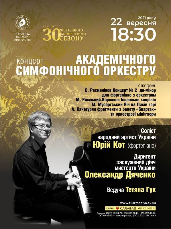 Уу першому концерті ювілейного сезону академічного симфонічного оркестру під орудою заслуженого діяча мистецтв України Олександра Дяченка солюватиме Юрій Кот, видатний український піаніст, народний артист України, викладач Національної музичної академії імені П.І.Чайковського, лауреат премії ім. Л. Ревуцького. У виконанні маестро Ю. Кота звучатиме один з найулюбленіших і найпопулярніших у світі фортепіанний концерт №2 до мінор Сергія Рахманінова і не тільки!