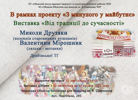 Черкаський обласний центр народної творчості запрошує на виставку "Від традиції до сучасності" у рамках проекту "З минулого до майбутнього".