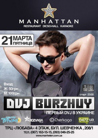 DVJ Burzhuy - это более 100 выступлений за год в ночных клубах Украины и зарубежья. Был резидентом таких клубов как: Privilege-Ibiza-Kiev, Опера (Луганск), 117(Феодосия), Cowboy (Судак), Maximum(Киев), Luxor, Sheriff, Арзы (Судак, резидентсво).