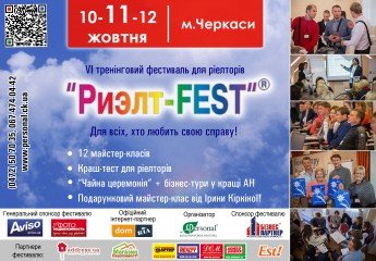 «Риэлт-FEST» – это ежегодный тренинговый фестиваль для риэлторов, который проходит каждый раз в новом городе. Первый фест 2009 прошел в Умани, в 2010 году – в Сумах, 2011 – в Запорожье, 2012 – в Чернигове, 2013 – в Киеве и в 2014 году «Риэлт-FEST» пройдет в Черкассах!