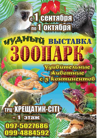 "Чудный Зоопарк" - это уникальная коллекция, которая насчитывает более 100 видов животных с 5 континентов. В ней собраны наиболее яркие и интересные представители фауны нашей планеты. Вы сможете увидеть забавных обезьянок, разнообразных змей, крокодилов, удивительных ящериц, черепах, варанов, необыкновенных и милых млекопитающих, таких как дикобраз, носуха, байбак, африканский еж, а также гигантских пауков, насекомых и многих других животных. Подарите радость себе и своим детям! Окунитесь в увлекательный мир живой природы!