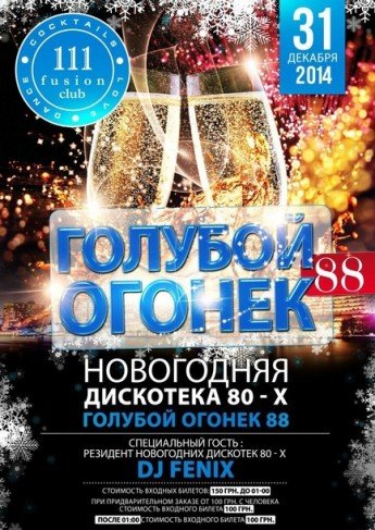 Уважаемые дамы и господа! Приглашаем Вас встретить Новый 2015 год в лучшем клубе нашего города, клубе 111. В новогоднюю ночь Вас ожидает изысканная японская и европейская кухня, а самое главное — незабываемая дискотека 80-х от лучшего диджея в этом стиле Dj FENIXA.