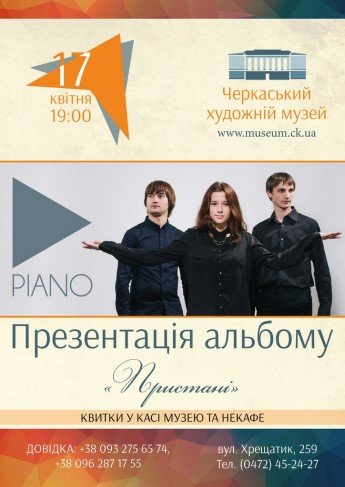Львівський гурт PIANO зіграє дебютний акустичний альбом «Пристані» у Черкаському художньому музеї. Концерт розпочнеться о 19:00.