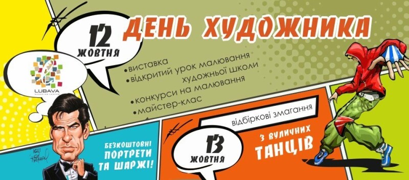 В память об этом дне - получите от ТРЦ «Любава» портрет или шарж! С 12:00 до 17:00 для вас бесплатно будут работать черкасские художники на первом и третьем этаже. Для маленьких - аквагрим, а с 13:30 - рисуют все! Развлекательная программа с конкурсами на рисование и изобретательность! Для улучшения настроения - подарки от ТРЦ и нежная скрипка в исполнении Юлии Бунь-Волкотруб.