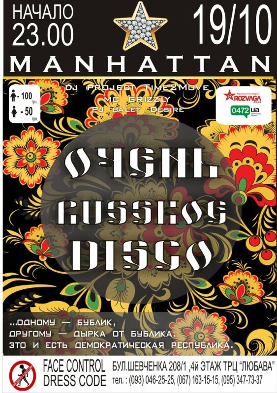 «Очень RUSSкое DISCO» - это замечательная возможность окунуться в уютную обстановку. Вас ждет незабываемый вечер в приятной компании ваших друзей и новых знакомых.