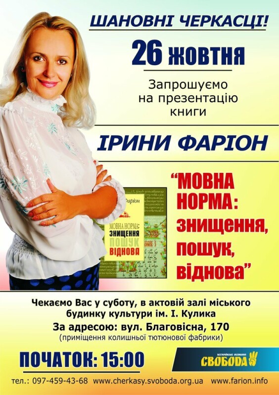 Известный языковед, народный депутат от ВО "Свобода" Ирина Фарион представит свою книгу "Мовна норма: знищення, пошук, віднова"