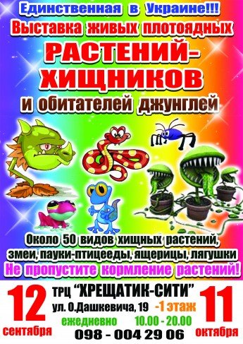 Уникальная в своем роде, единственная в Европе выставка живых насекомоядных растений-хищников уже в Черкассах! Спешите! Посетители выставки смогут приоткрыть занавес тайны над загадочными творениями природы – зелеными хищниками, узнать об их жизни и охоте. Необыкновенные, яркие и восхитительно красивые – их созерцание заставляет отвлечься от повседневных забот, погрузиться в мир прекрасного и оставляет неизгладимое приятное впечатление. На выставке представлено около 50 видов хищных растений, а также гигантские пауки-птицееды, в том числе самый большой паук в мире – Голиаф, насекомые, ящерицы, змеи и лягушки. На выставке Вы можете приобрести понравившееся экзотическое растение.
