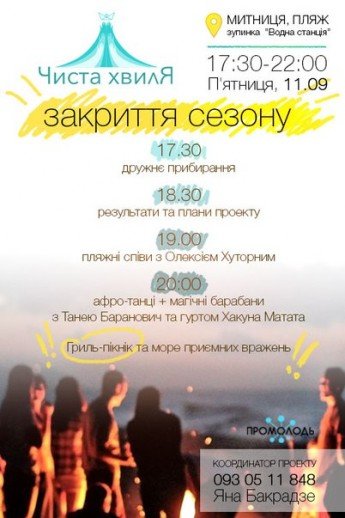 ПРОМОЛОДЬ запрошує всіх охочих разом завершити сезон літніх проектів та насолодитися останнім теплом на пляжному просторі Чиста Хвиля, в п'ятницю 11 вересня з 17:30 до 22:00.
