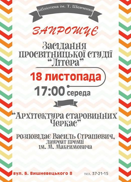 Черкаська обласна бібліотека ім. Т. Шевченка запрошує цієї середи, 18 листопада о 17:00, відвідати засідання Просвітницької студії “Літера” за темою “Архітектура старовинних Черкас”.