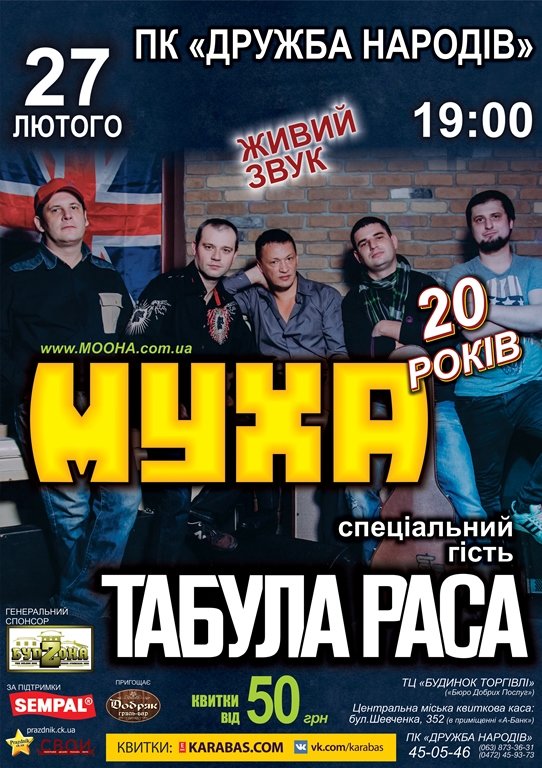 Большим рок-концертом отметит свой прошедший 20-ти летний юбилей группа "МУХА" в ДК "Дружба Народов" (г.Черкассы). В качестве специального гостя в выступлении примет участие также прошлогодний юбиляр украинской рок-сцены группа "Табула Раса". Всех приглашаем на праздник рон-н-ролла!