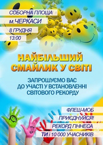 На Соборной площади Черкасс 10000 жителей и гостей города смогут стать рекордсменом, одновременно засветив в небо фонарики в виде улыбки! Представители Книги рекордов Гиннеса и Книги рекордов Украины зарегистрируют установления рекорда и прославят наш город на весь мир!