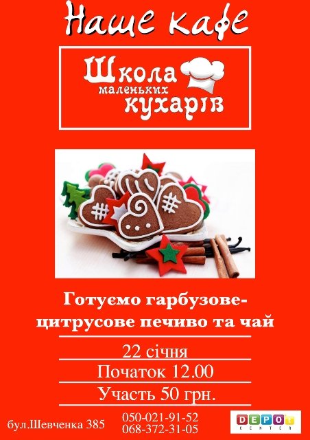 22 січня у м.Черкасси, за адресою :бул.Шевченка,385 ми чекаємо Вас та ваших діточок та будемо готувати гарбузово-цитрусове печиво та чай.